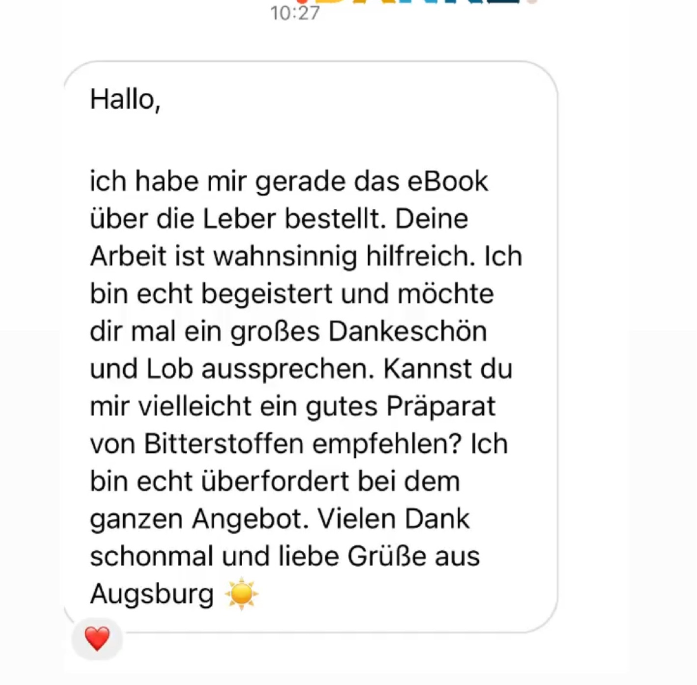 “Hallo Christine, ich möchte mich bei dir bedanken. Durch deine persönliche Beratung, wie ich meine Lebergesundheit verbessern könnte, haben sich meine Symptome stark verbessert. Ich kann nun wieder eine größere Auswahl an Lebensmitteln essen, ohne dass ich gleich Bauchschmerzen oder einen Blähbauch bekomme. Deine Tipps lassen sich gut in den Alltag integrieren und ich verbessere meine tägliche Routine stückchenweise. Nach der Leber möchte ich nun eine Entsäuerung, wie du sie beschreibst, durchführe. Vielen Dank. Auch für deinen tollen Beiträge.”